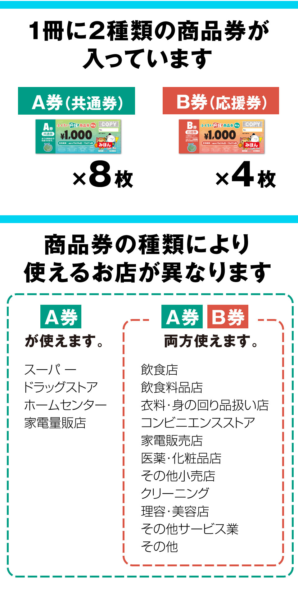 ふくろい応援商品券は、A券(共通券)8枚とB券(応援券)4枚がセットになっています。商品券の種類によって使えるお店が異なります。